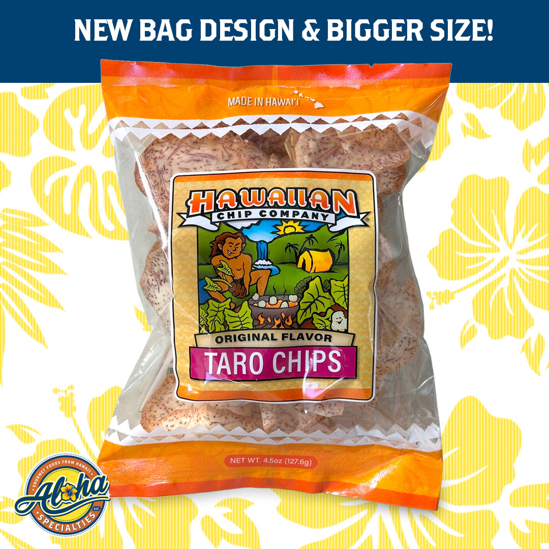 Hand-peeled taro are thinly sliced, cooked until crisp and lightly salted to create the Hawaiian Chip Company Original Flavor Taro Chips. All-natural and made in Hawaii!
